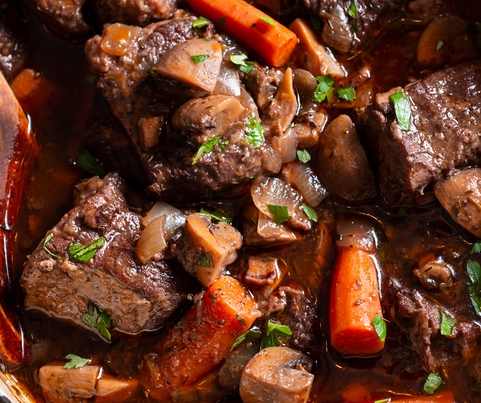 Notre Bœuf Bourguignon réunit des morceaux de bœuf fondants, des carottes, des oignons, des champignons et du vin rouge dans une sauce riche et parfumée, lentement mijotée pour révéler toutes les saveurs traditionnelles. Chaque bouchée offre tendreté, goût intense et gourmandise, pour un plat réconfortant et convivial qui fera le bonheur de vos invités. Réchauffez à feu doux dans une casserole