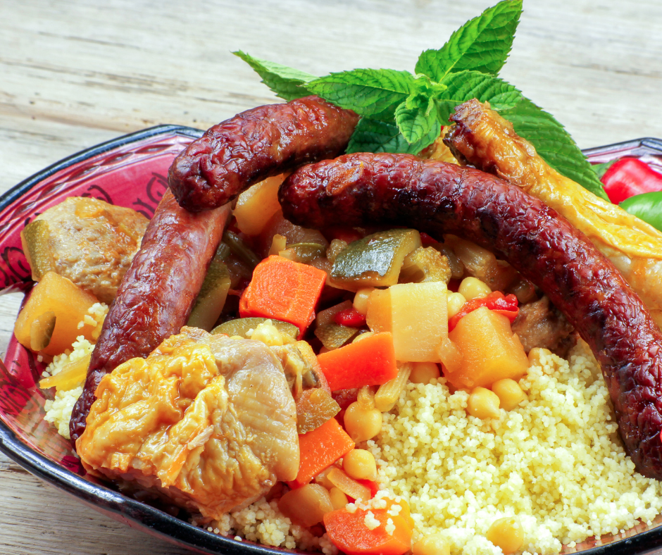 Notre couscous est un plat généreux et complet, alliant agneau, bœuf, poulet, merguez, légumes frais et pois chiches et une semoule moelleuse. Chaque bouchée vous transporte dans un voyage gourmand, avec des saveurs équilibrées et authentiques !
